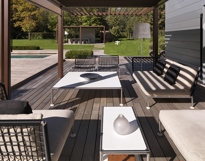 A table becomes reality through design, image definition and industrial processing. An object for various moments of the day, adding a personal and highly pleasing note, totally free of restrictions, combining practicality with unerringly sophisticated elegance. The satinized stainless steel structure can be proposed with a marine laminate top.